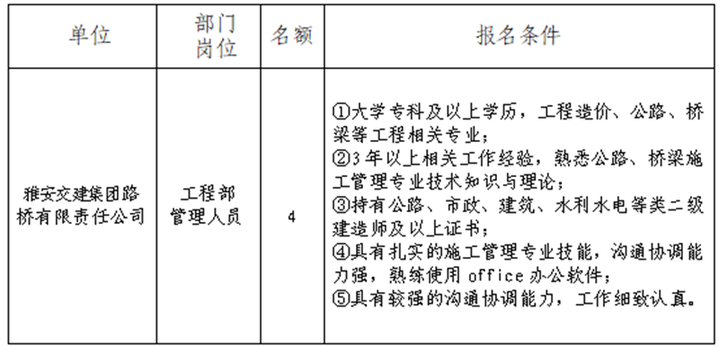 根據發(fā)展需要,決定面向社會公開招聘雅安市交通建設(集團)有限責任公司(以下簡稱“雅安交建集團”)所屬子公司工作人員4名,現將有關事項公告如下: