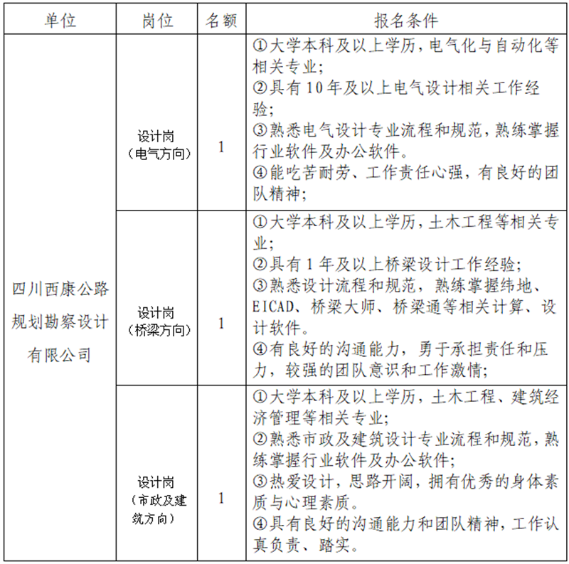 根據(jù)發(fā)展需要,決定面向社會公開招聘雅安市交通建設(shè)(集團(tuán))有限責(zé)任公司(以下簡稱“雅安交建集團(tuán)”)所屬子公司專業(yè)技術(shù)人才3名,現(xiàn)將有關(guān)事項(xiàng)公告如下: