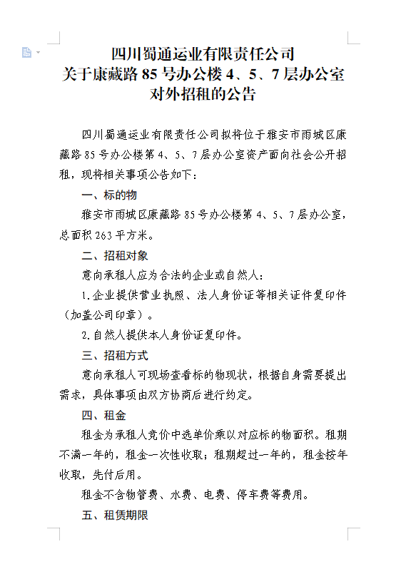 四川蜀通運業(yè)有限責任公司關于康藏路85號辦公樓4、5、7樓資產(chǎn)租賃公告附件