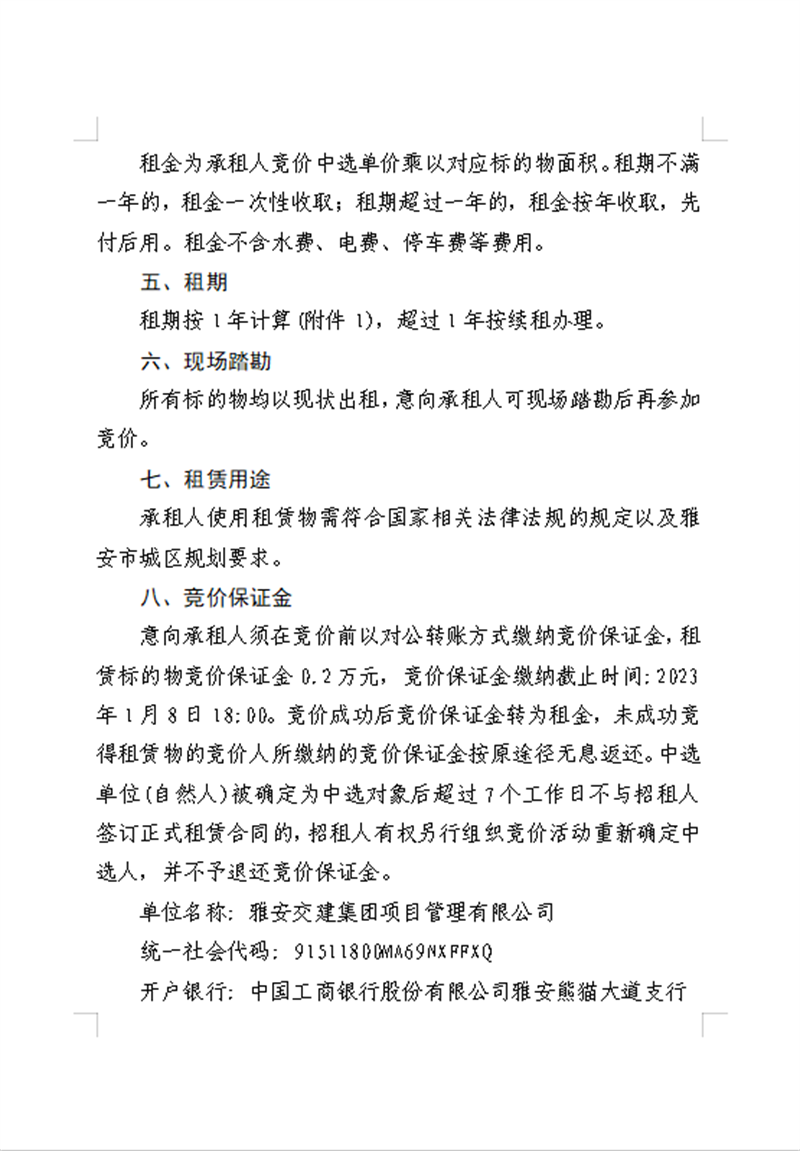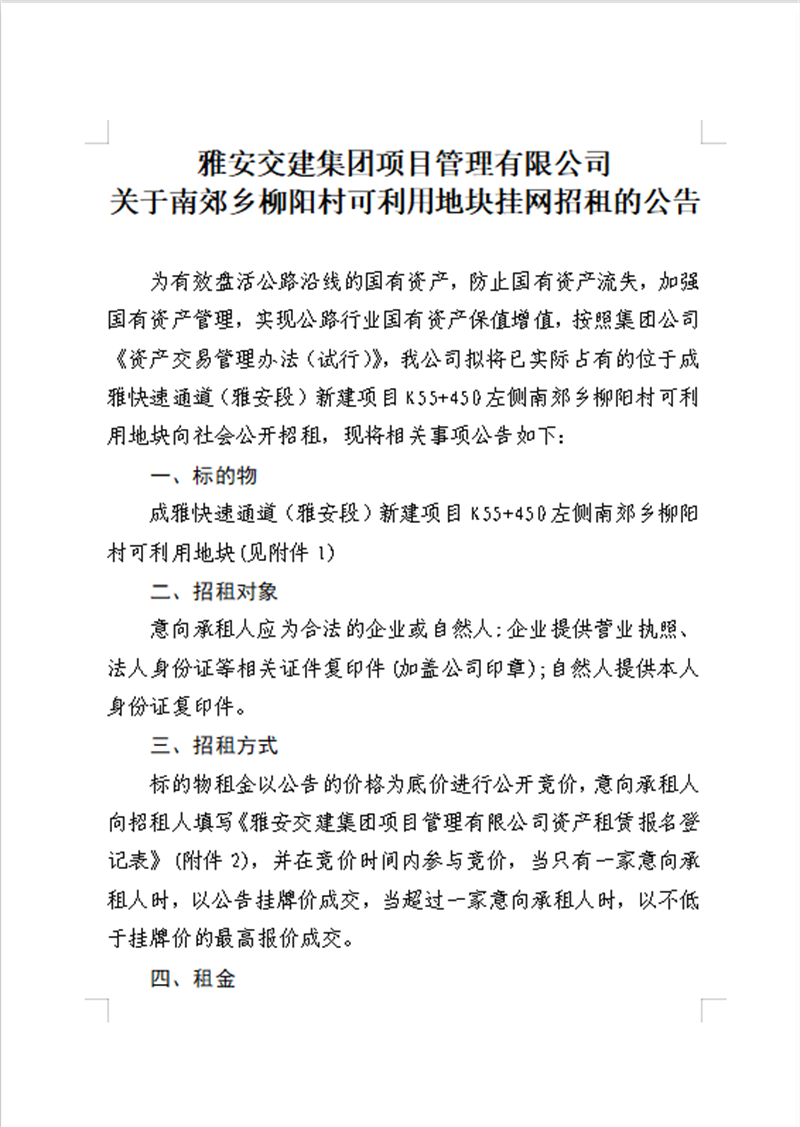 雅安交建集團項目管理有限公司關(guān)于南郊鄉(xiāng)柳陽村可利用地塊公開招租的公告
