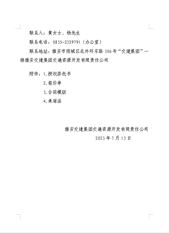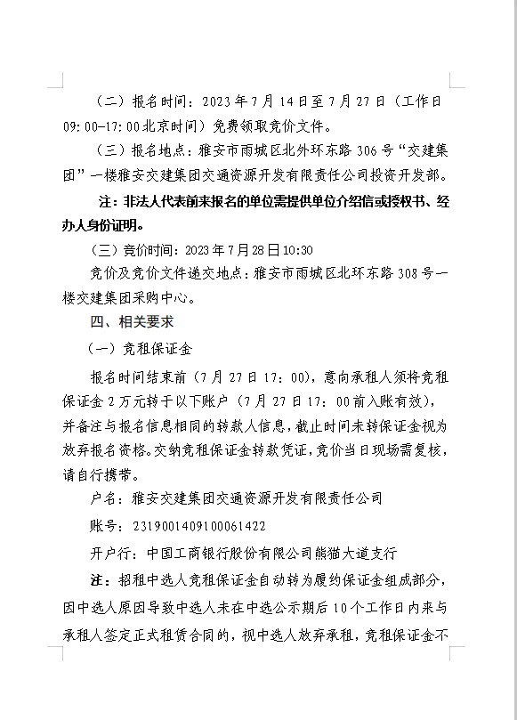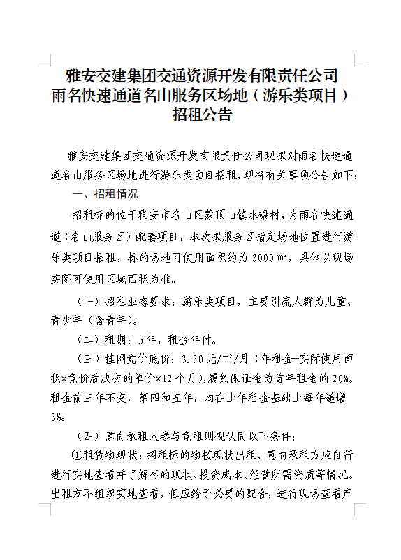 雅安交建集團(tuán)交通資源開(kāi)發(fā)有限責(zé)任公司雨名快速通道名山服務(wù)區(qū)場(chǎng)地(游樂(lè)類(lèi)項(xiàng)目)招租公告