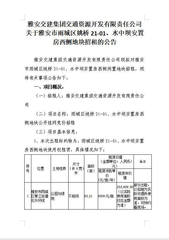 雅安交建集團交通資源開發(fā)有限責任公司關于雅安市雨城區(qū)姚橋21-01、水中壩安置房西側地塊招租的公告