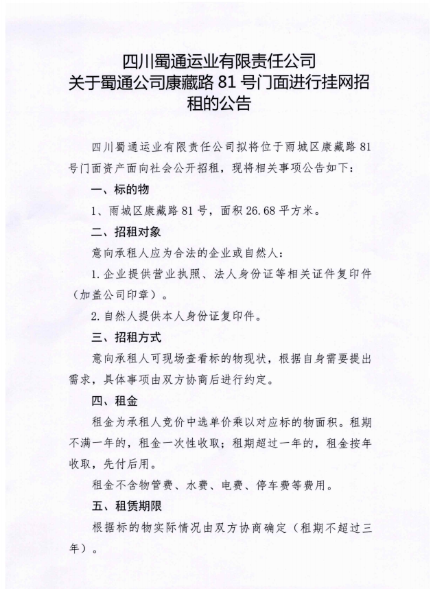 ËÄ´¨Êñͨß\˜I(y¨¨)ÓÐÏÞØŸÈι«Ë¾êPÓÚÊñͨ¹«Ë¾¿µ²ØÂ·81Ì–éTÃæßMÐÐ’ì¾W(w¨£ng)ÕÐ×âµÄ¹«¸æ£º¸½¼þ