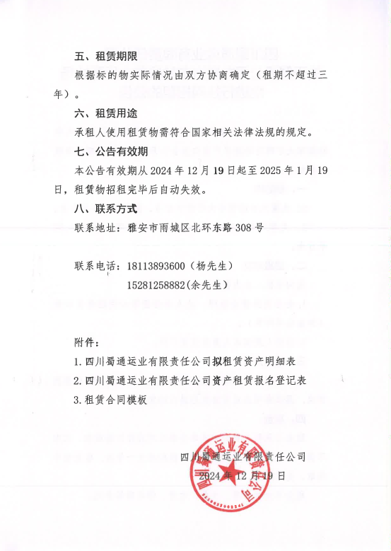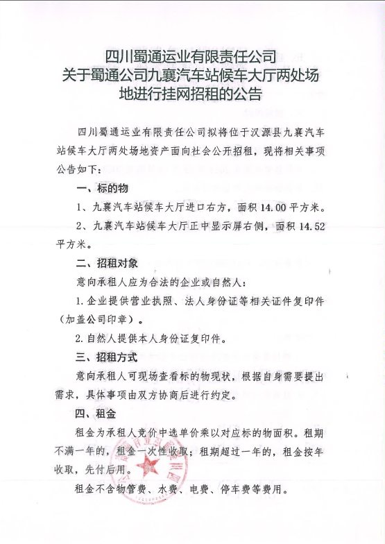 四川蜀通運業(yè)郵箱責任公司關于蜀通公司九襄汽車站候車大廳兩處場地進行掛網(wǎng)招租的公告附件
