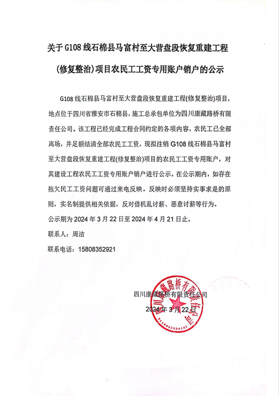 關(guān)于G108線石棉縣馬富村至大營(yíng)盤(pán)段恢復(fù)重建工程(修復(fù)整治)項(xiàng)目農(nóng)民工工資專(zhuān)用賬戶銷(xiāo)戶的公示