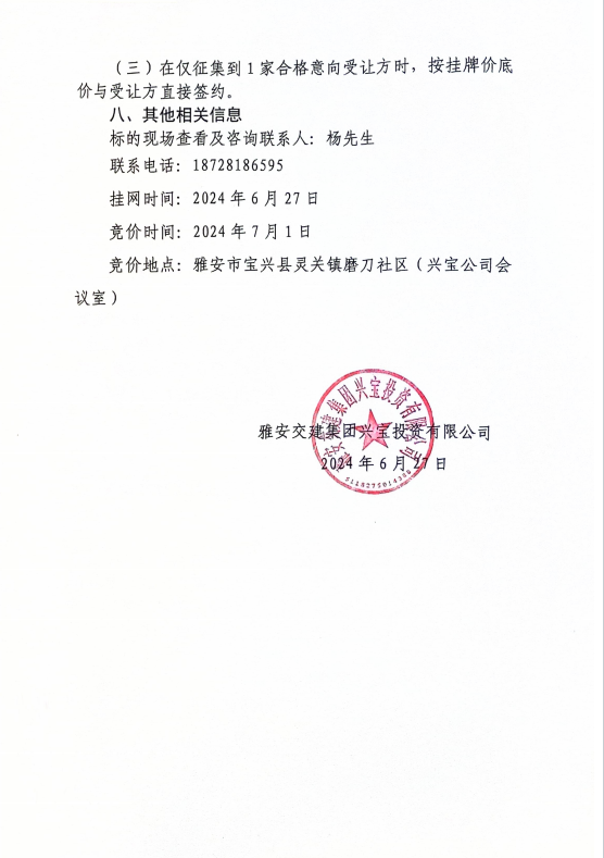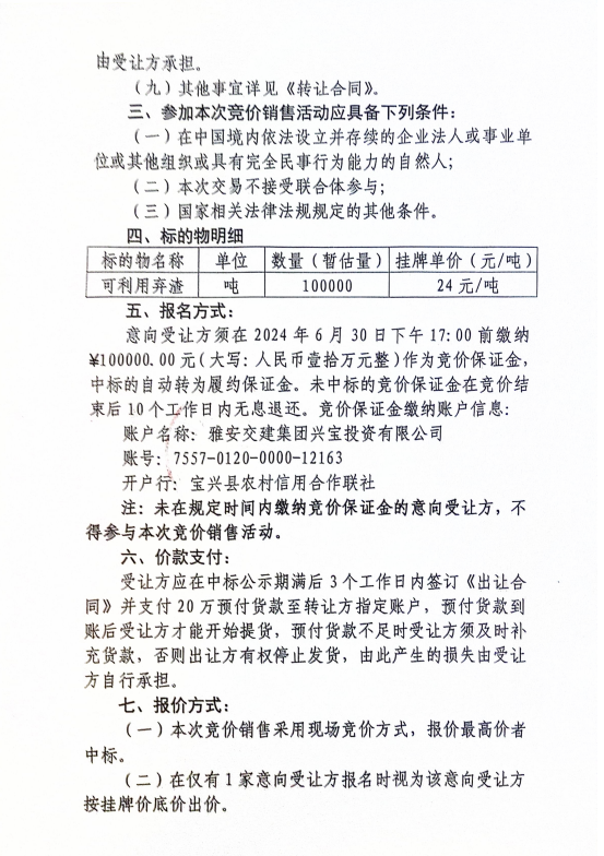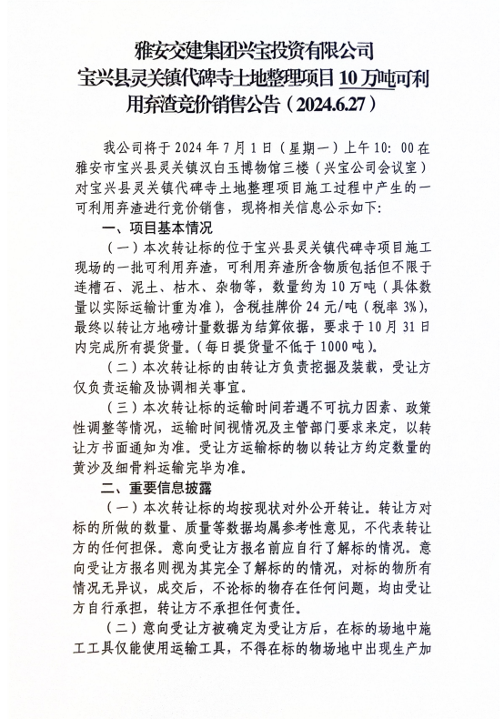 雅安交建集團(tuán)興寶投資有限公司寶興縣靈關(guān)鎮(zhèn)代碑寺土地整理項(xiàng)目10萬噸可利用棄渣競價(jià)銷售公告(2024.6.21)