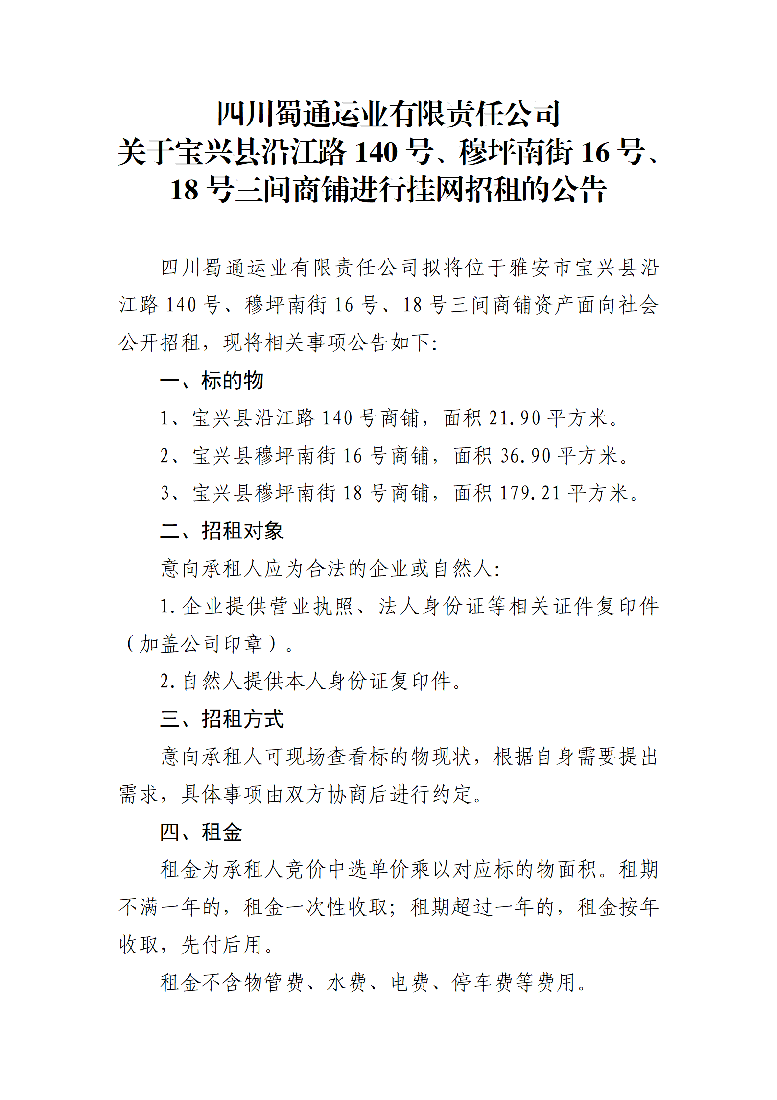 四川蜀通運業(yè)有限責任公司 關(guān)于寶興縣沿江路140號、穆坪南街16號、18號三間商鋪進行掛網(wǎng)招租的公告