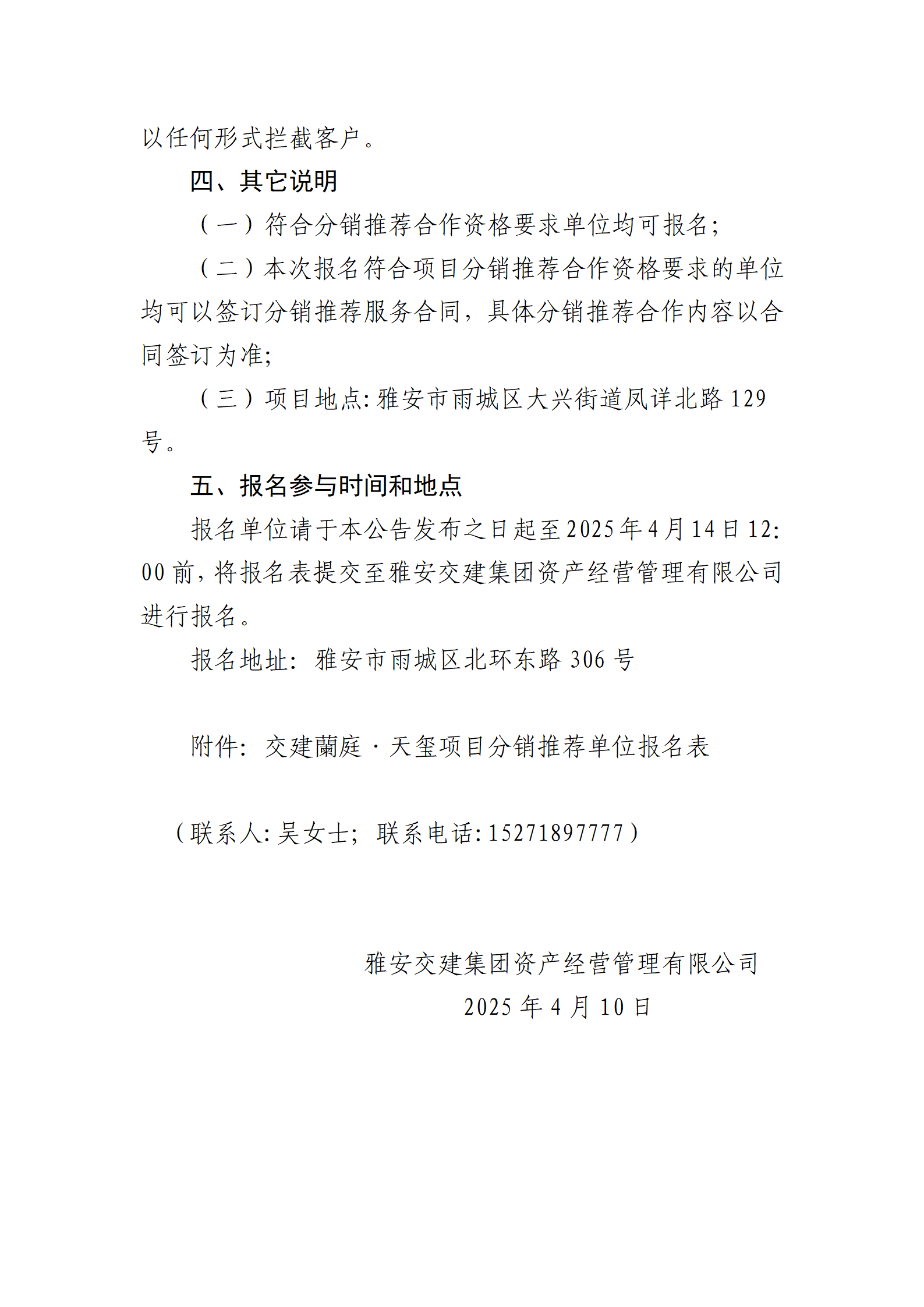 雅安交建集團(tuán)資產(chǎn)經(jīng)營(yíng)管理有限公司 關(guān)于征集蘭庭·天璽項(xiàng)目分銷推薦合作單位的公告