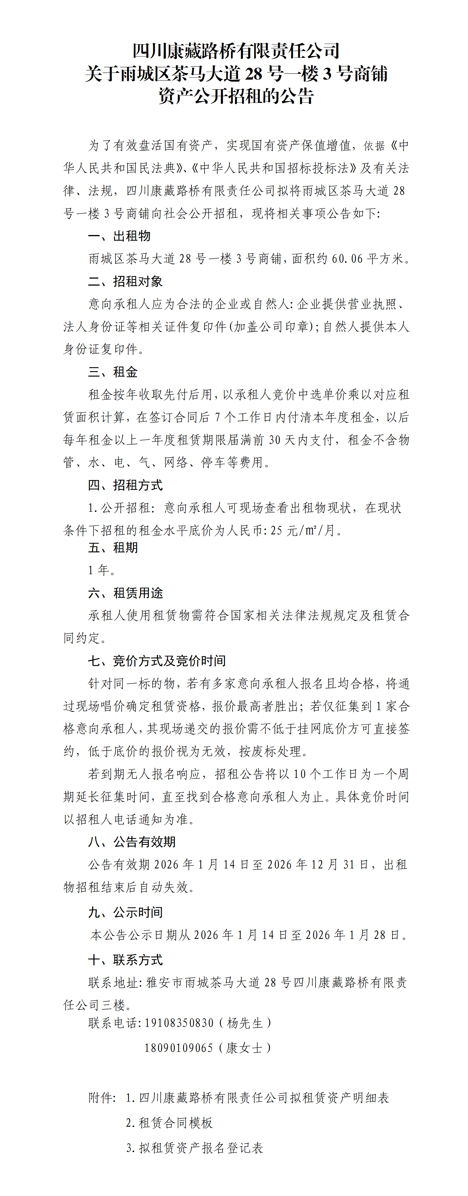 四川康藏路橋有限責(zé)任公司關(guān)于雨城區(qū)茶馬大道28號(hào)一樓3號(hào)商鋪 資產(chǎn)公開招租的公告