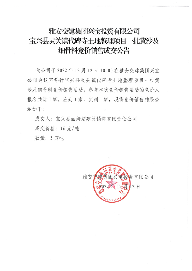 雅安交建集團(tuán)興寶投資有限公司寶興縣靈關(guān)鎮(zhèn)代碑寺土地整理項(xiàng)目5萬(wàn)噸黃沙及細(xì)骨料競(jìng)價(jià)銷售成交公告(2022-12-12)