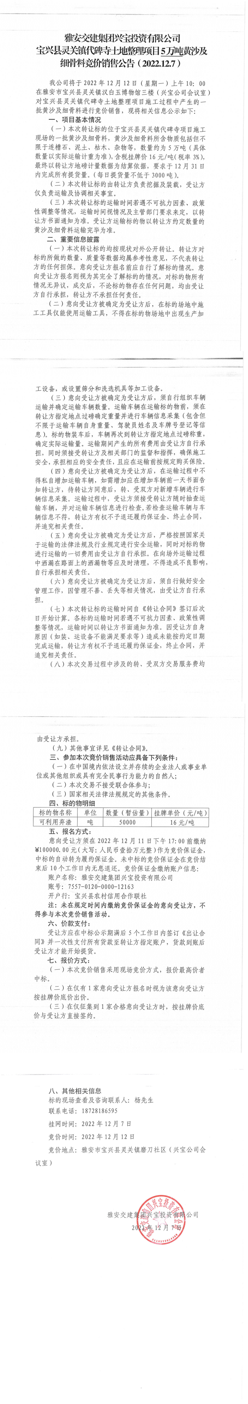 雅安交建集團興寶投資有限公司寶興縣靈關鎮(zhèn)代碑寺土地整理項目一批黃沙及細骨料競價銷售掛網(wǎng)公告2022.12.7