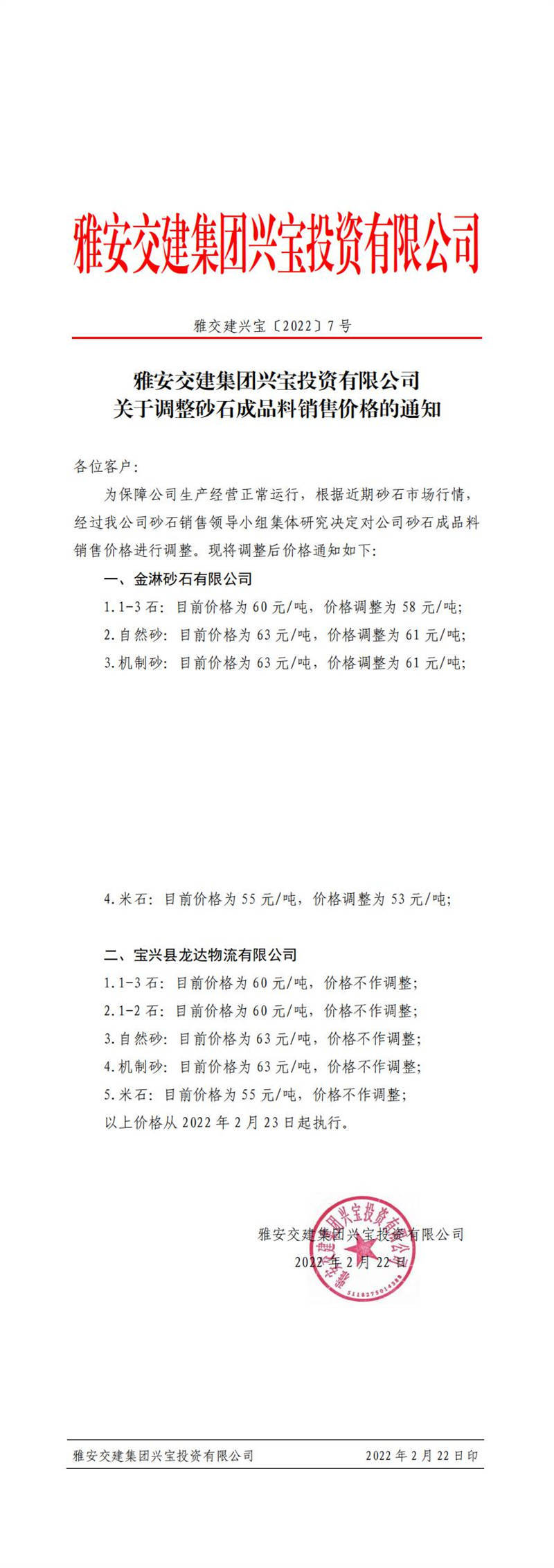 雅安交建集團興寶投資有限公司 關(guān)于調(diào)整砂石成品料銷售價格的通知(2022-2-23)
