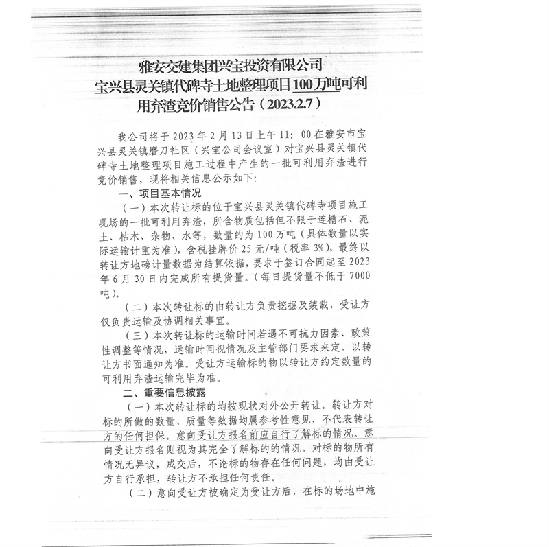 雅安交建集團(tuán)興寶投資有限公司靈關(guān)鎮(zhèn)代碑寺土地整理項(xiàng)目100萬噸可利用棄渣競價銷售公告(2023.2.7)