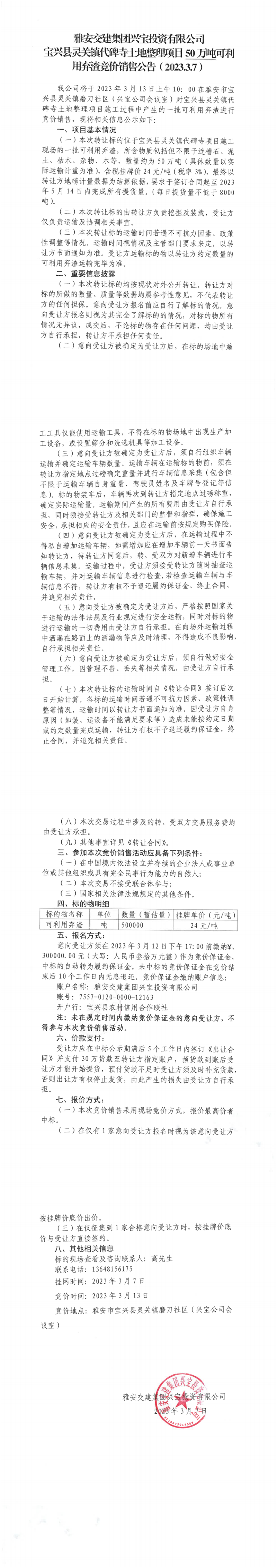 雅安交建集團(tuán)興寶投資有限公司靈關(guān)鎮(zhèn)代碑寺土地整理項(xiàng)目30萬(wàn)噸可利用棄渣競(jìng)價(jià)銷(xiāo)售公告(2023.3.8)