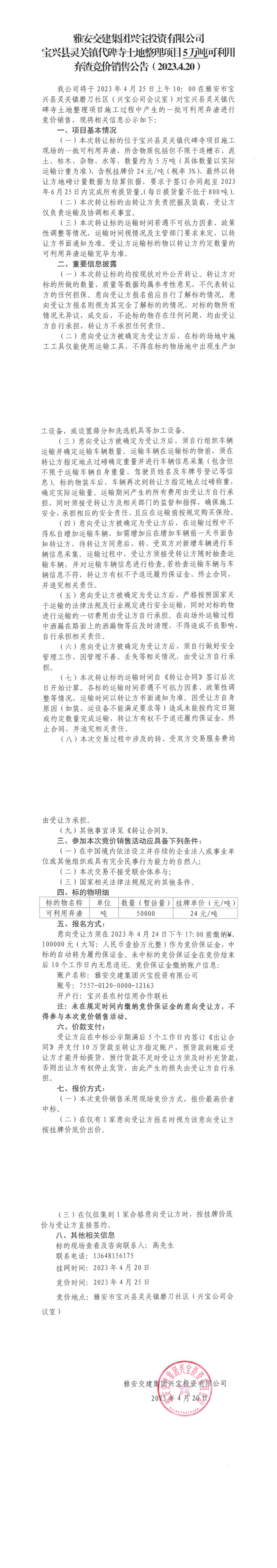 雅安交建集團(tuán)興寶投資有限公司靈關(guān)鎮(zhèn)代碑寺土地整理項(xiàng)目5萬噸可利用棄渣競(jìng)價(jià)銷售公告(2023.4.20)