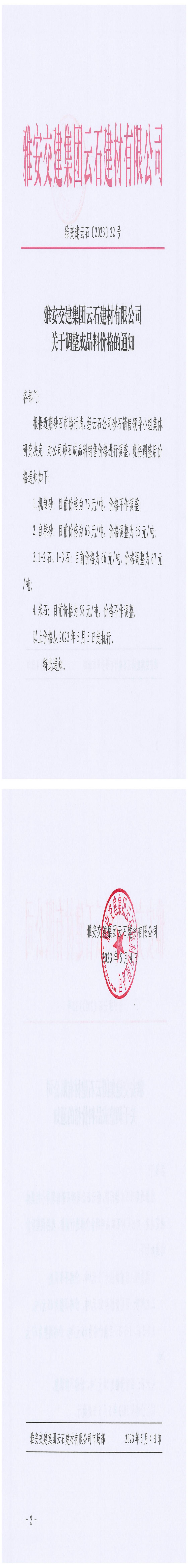 雅交建云石建材有限公司調(diào)價通知(2023-5-4)