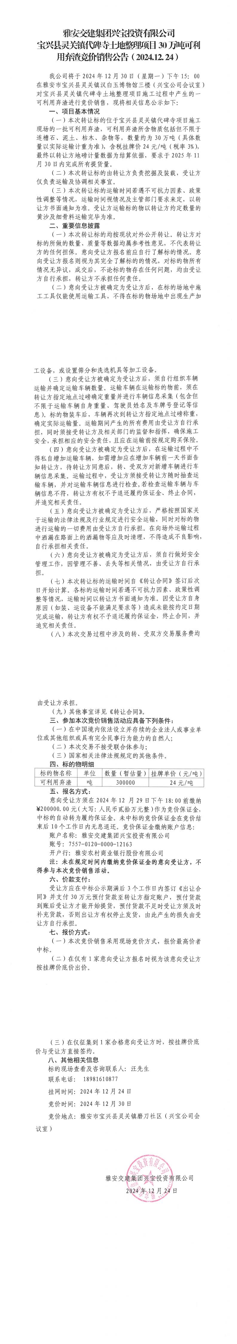 雅安交建集團興寶投資有限公司靈關(guān)鎮(zhèn)代碑寺土地整理項目30萬噸可利用棄渣競價銷售公告(2024.12.24)