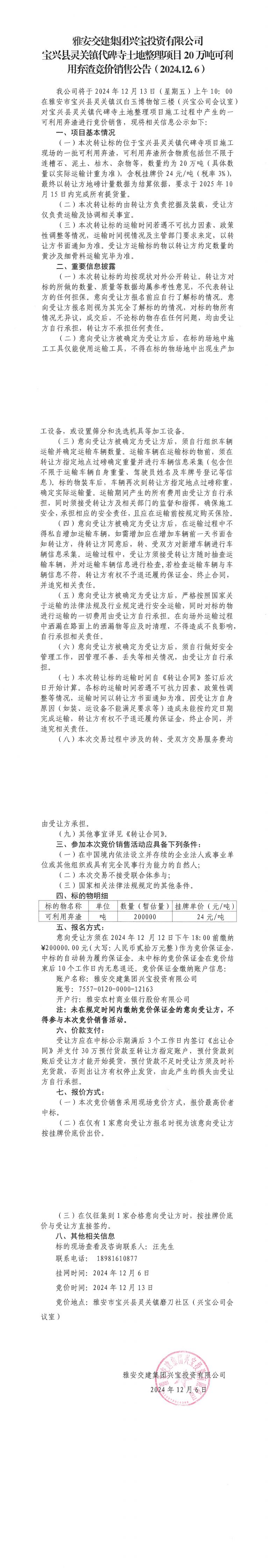 雅安交建集團(tuán)興寶投資有限公司靈關(guān)鎮(zhèn)代碑寺土地整理項(xiàng)目10萬噸可利用棄渣競(jìng)價(jià)銷售公告(2024.12.06)