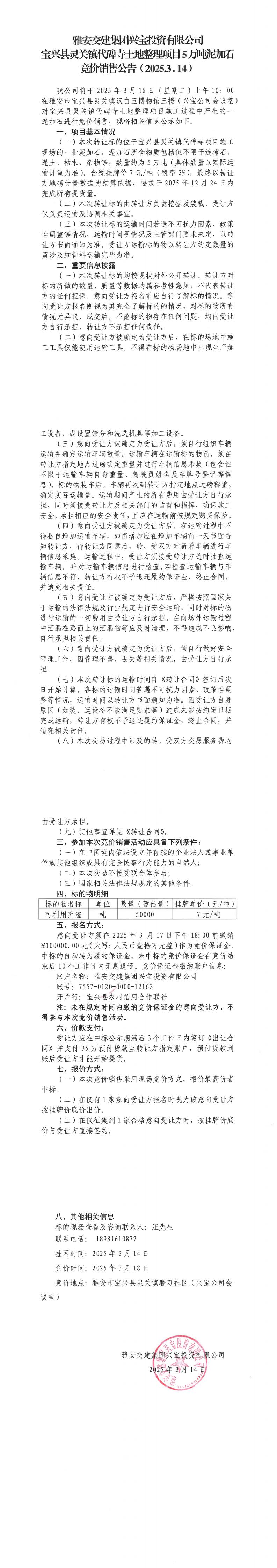 雅安交建集團興寶投資有限公司寶興縣靈關(guān)鎮(zhèn)代碑寺土地整理項目5萬噸泥加石競價銷售公告(2025.03.14)